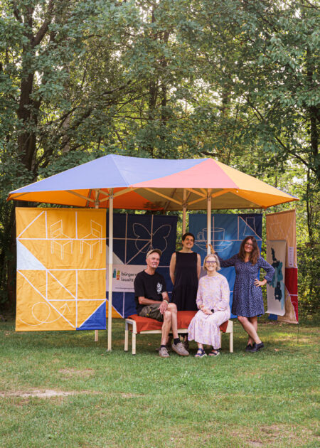 Jan Hufenbach (Raumpionierstation Oberlausitz), Ina Fettig und Dagmar Schmidt (Lausitzer Perspektiven) und Susanne Gärtner (Kulturfabrik Meda und riesa e.V.) posieren in der MitmachBUDE. Foto: (c) Valentina Troendle.