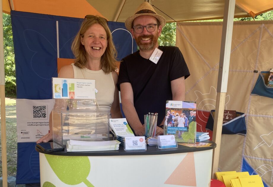 Karla Fornoville und Markus Wegner vom Knotenpunkt Elbe-Elster in Finsterwalde luden Besucher:innen der Region ein, von ihren Ideen, Vorhaben und Projekten zu berichten. Mit der „Sprechstunde on Tour“ konnten direkt vor Ort Beratungstermine vereinbart und spontane Gespräche geführt werden – die mobile Sprechstunde „Auf’n Kaffee mit der Bürgerregion“ wurde rege genutzt.