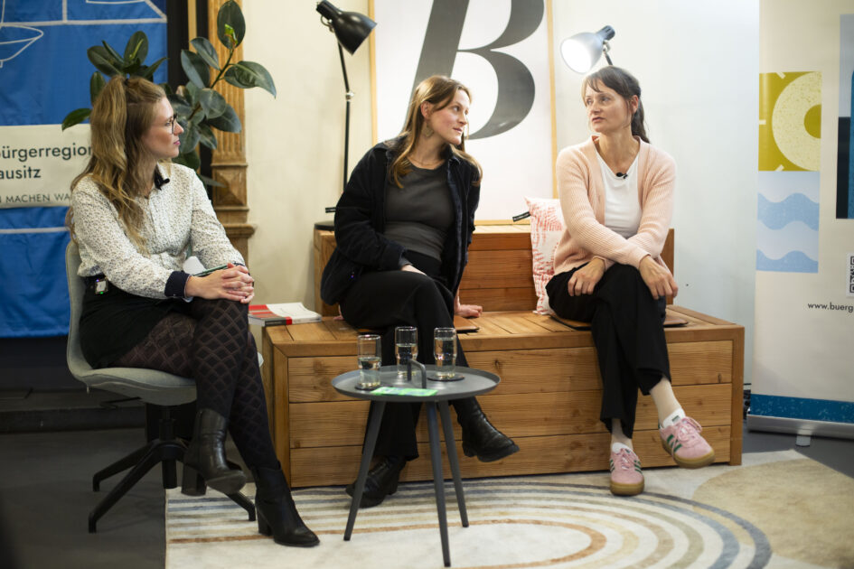 Von links: Franziska Stölzel (Moderation), Charlotte Campbell (SPREEAKADEMIE) , Sandra Malik (Stradowsphäre)