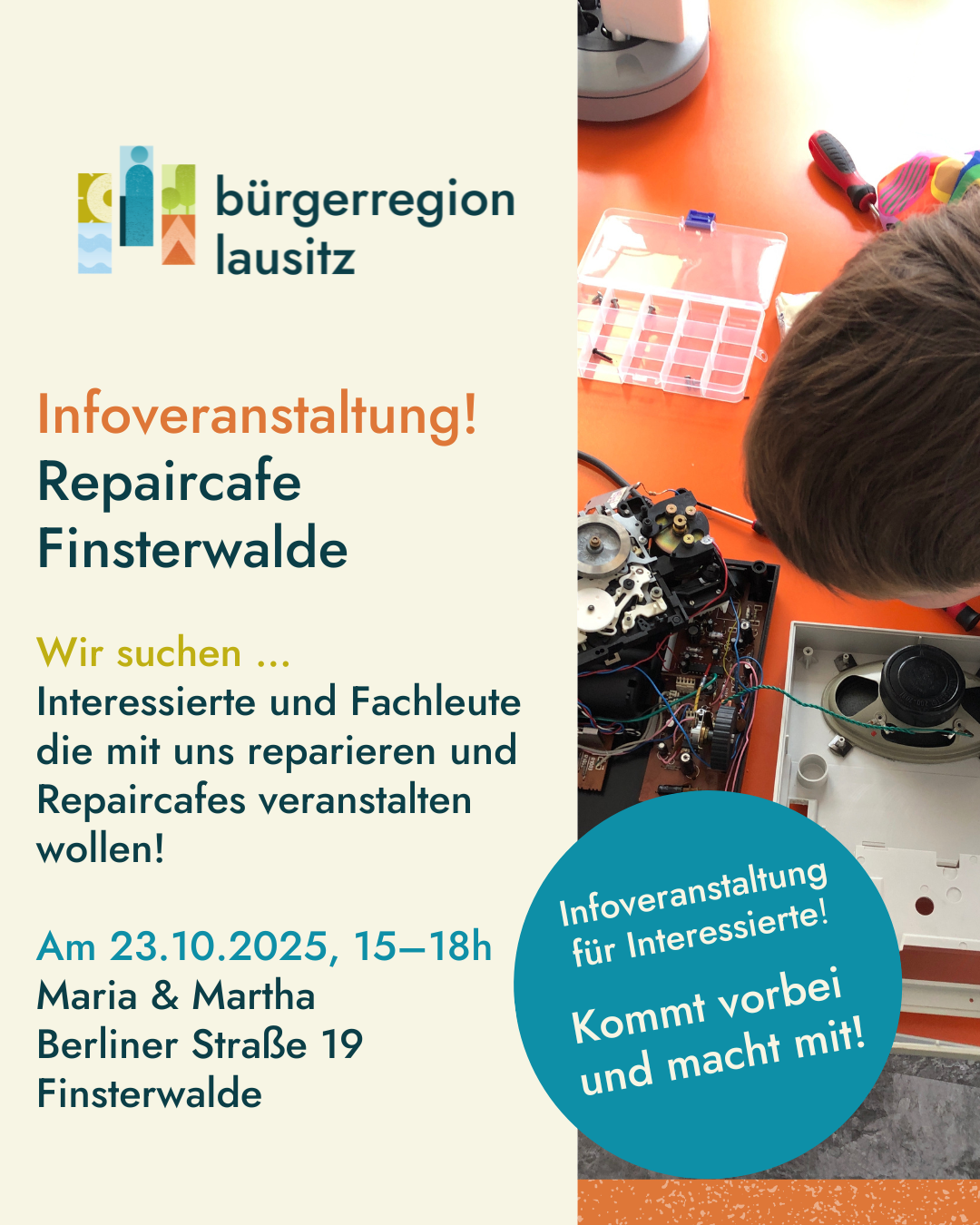 Interessierte und Fachleute sind herzlich eingeladen zu einem Informationsabend rund um die Initiierung eines Repaircafés in Finsterwalde. Wir stellen das Konzept vor, besprechen mögliche Abläufe und laden zum Austausch von Ideen und Erfahrungen ein.
